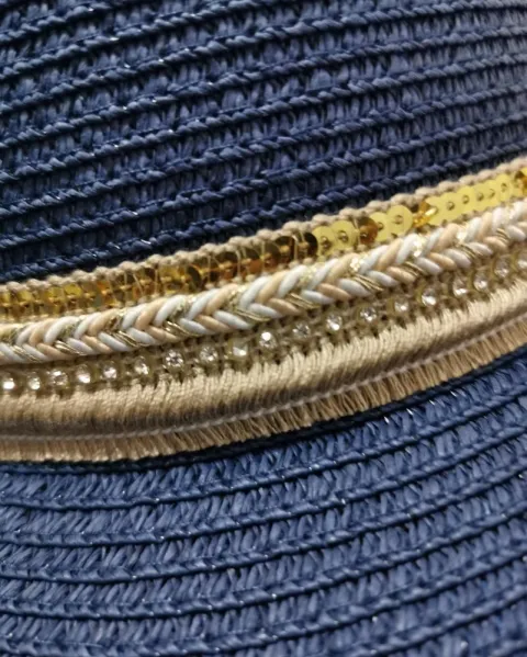 Sobrero playero Nuevo. Color azul marino. Con detalle de cinta beige, tejida, bordada y con pedrería. Ala ancha. Redondo. Hueco para la cabeza 19 cm diámetro, circunferencia 56.5 cm. Diámetro total 42 cm.