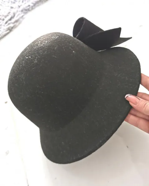 Sombrero negro de felpa. Sombrero negro de felpa. La foto hace que se vean chispas plateadas, pero solo son pequeños hilitos propios de la felpa. Tiene un gran moño, lo puedes colocar atras, al lado o al frente según tu gusto y que el sombrero no tiene lado.