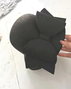 Sombrero negro de felpa. La foto hace que se vean chispas plateadas, pero solo son pequeños hilitos propios de la felpa. Tiene un gran moño, lo puedes colocar atras, al lado o al frente según tu gusto y que el sombrero no tiene lado.