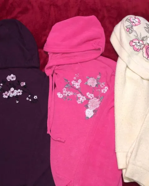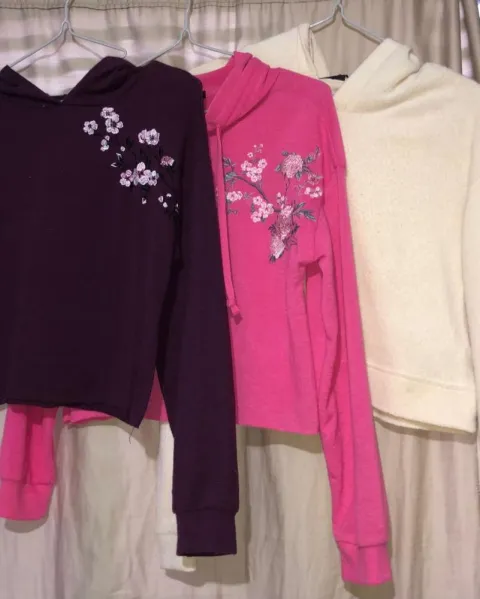 RUE 21 SET DE 3 SUDADERAS CORTAS. Se encuentran las 3 en excelente condición la morada XS y la rosa XS solo se usaron un par de veces la color crema M tiene más uso pero esta en excelente condición tienen un hermoso diseño de bordadoMiden 50cm de largo por 50cm de ancho