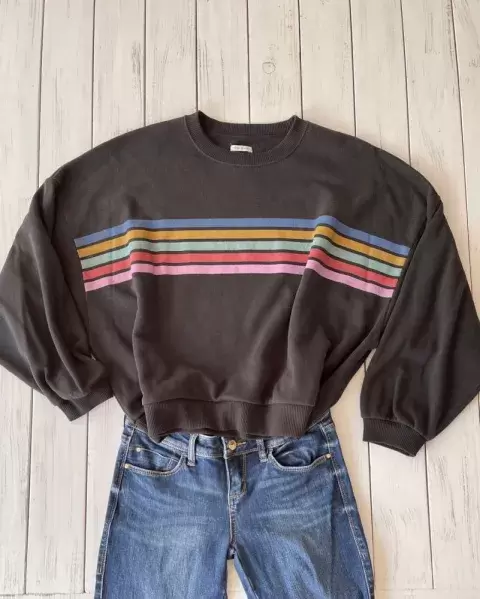 Sudadera negra deslavada con rayas al frente. Talla: S, considero que es oversized. Medidas: 71 cm de hombros, 69 cm de axila y 56.5 cm de largo. Súper súper suave, cómoda.