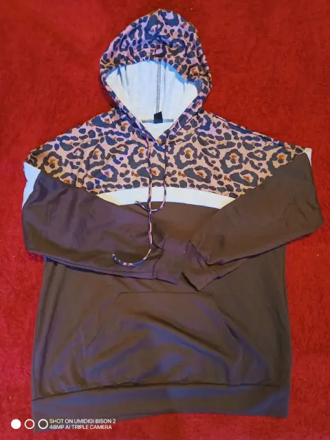 Sudadera con capucha en tonos café y animal print. Nueva sin detalles.