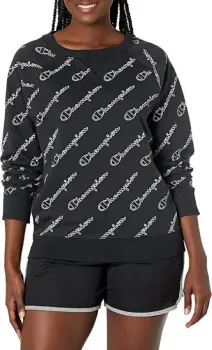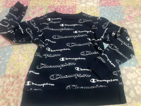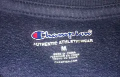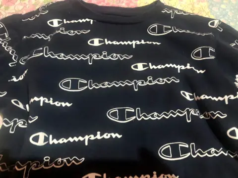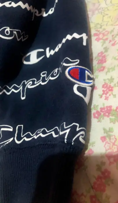 Bonita sudadera azul marino Champion, estampada con logos de la marca, es talla M.