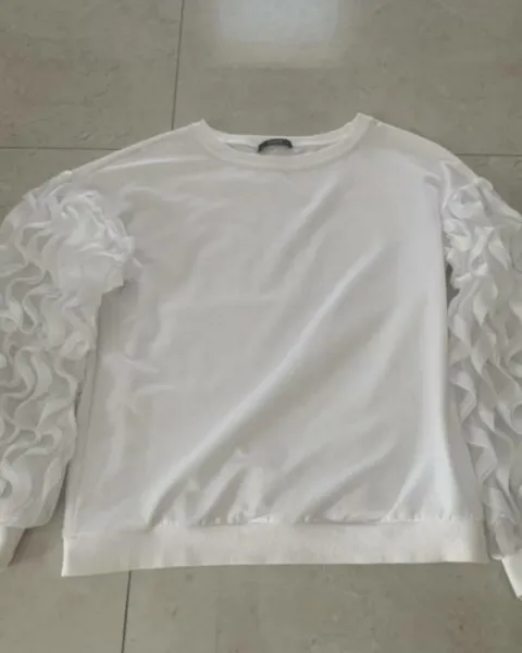 Sudadera con aplicaciones. ♻️ En este prefil apoyamos al medio ambiente y las cajitas de envío son recicladas ♻️. Hermosa sudadera con mangas tipo organza es muy linda, talla S pero queda a talla L yo soy xl y me queda pero me gusta oversize no justa al cuerpo