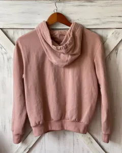 Sudadera rosa afelpada por dentro con capucha. Trae bordado un corazón negro. Talla: XSMedidas: 52 cm axila y 54 cm largo.Trae una pequeña mancha en el bolsillo frontal. Así la compré.
