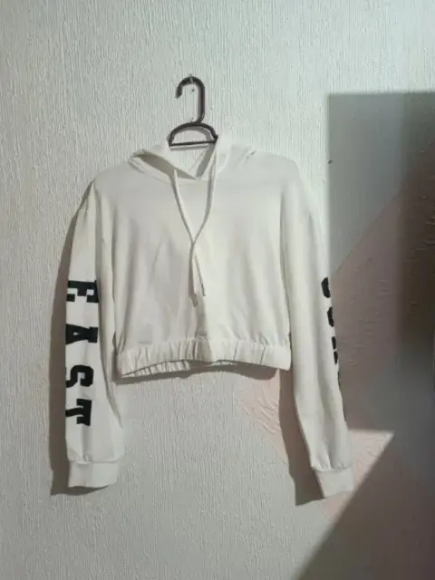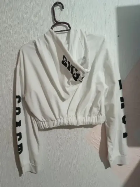 Sudadera corta blanco con gorra. Sudadera con resorte en la parte de abajo, corta y de manga larga, siendo la tela muy ligera y con gorra. Talla M/L pero en verdad es más tipo chica/mediana.Precio negociable.