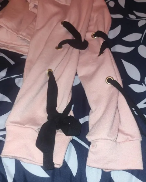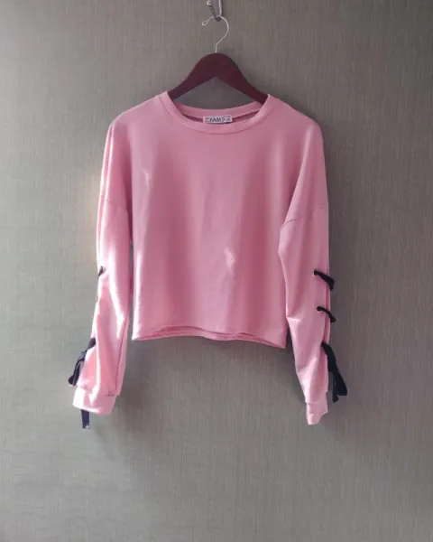 Sudadera corta rosa con cintas negras en las mangas