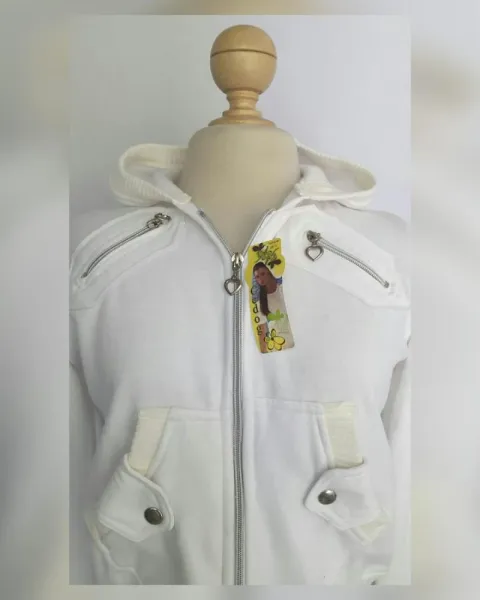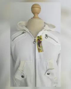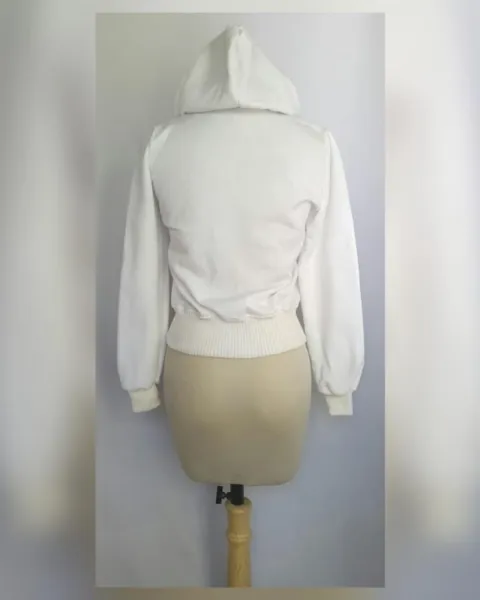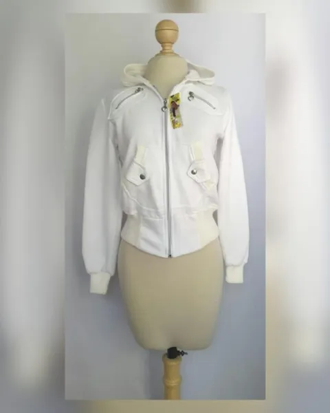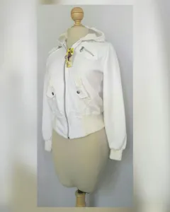 Sudadera estilo bomber color BLANCO POLAR, capucha integrada NO DESMONTABLE, cierre p/cremallera, 2 bolsos parche simulados c/cremallera, bolso tipo canguro delantero c/snap, cardigan en zona baja p/mejor ajuste, manga larga terminada en cardigan e interior afelpado. UNITALLA (da a S/M). Dimensiones cms: 38 hombro, 49.5 axila, 33 (da hasta 42) zona baja, 56.5 largo, 62 largo manga. 70% algodón, 30% poliéster. Para lavado en casa.