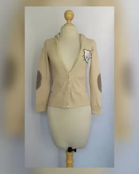 Sudadera ligera tono CAPUCHINO c/capucha NO DESMONTABLE, cuello pico, sin sistema de cierre, botones fantasía delanteros, 2 bolsos plastrón, parche Hello Kitty y parches rayas CAPUCHINO/CHOCOLATE en codos mangas. UNITALLA (da a S/M) Dimen cms: 40 hombro, 44 axila, 38 cintura, 45 zona baja, 48 largo, 56 largo manga 100% acrílico. P/lav casa.**P/LA COMPOSICIÓN ES STRETCH P/SIN SUBIR A LA SIG TALLA**