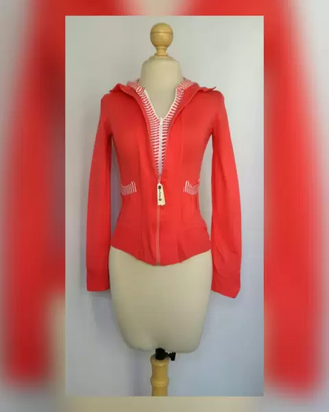 Sudadera Ligera Capucha y Rayas SALMÓN. Sudadera ligera tono SALMÓN c/capucha NO DESMONTABLE, cuello clásico c/solapas, cierre p/doble cremallera, 2 bolsos plastrón, rayas SALMÓN/BLANCO en capucha, zona frontal y bolsos. UNITALLA (da a S/M) Dimen cms: 38 hombro, 43 axila, 38 cintura, 43 zona baja, 55 largo, 66 largo manga 100% acrílico. P/lav casa.**P/LA COMPOSICIÓN ES STRETCH P/SIN SUBIR A LA SIG TALLA**