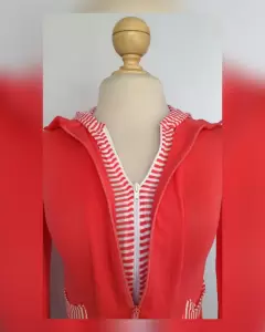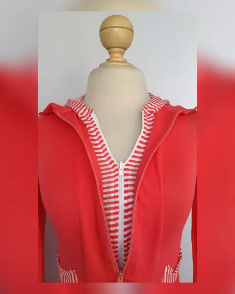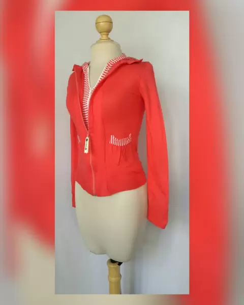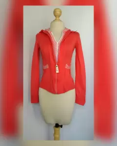 Sudadera ligera tono SALMÓN c/capucha NO DESMONTABLE, cuello clásico c/solapas, cierre p/doble cremallera, 2 bolsos plastrón, rayas SALMÓN/BLANCO en capucha, zona frontal y bolsos. UNITALLA (da a S/M) Dimen cms: 38 hombro, 43 axila, 38 cintura, 43 zona baja, 55 largo, 66 largo manga 100% acrílico. P/lav casa.**P/LA COMPOSICIÓN ES STRETCH P/SIN SUBIR A LA SIG TALLA**