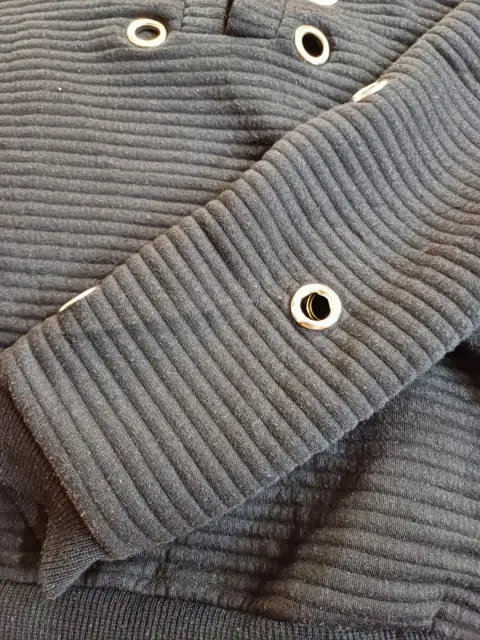 Sudadera Negra. Sudadera color negro, manga larga, con orificios con detalles metálicos en color plateado en la parte de cuello y mangas, marca Wanna This, talla chica (s), en perfectas condiciones.