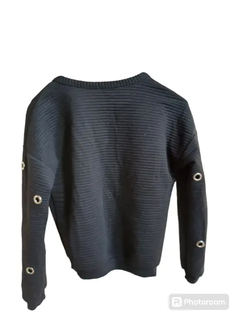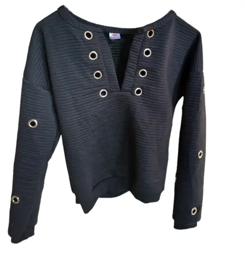 Sudadera color negro, manga larga, con orificios con detalles metálicos en color plateado en la parte de cuello y mangas, marca Wanna This, talla chica (s), en perfectas condiciones.