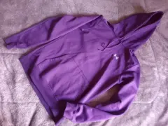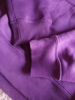 Morada, con capucha y sin detalles, talla xs, pero sin problema puede quedar a s