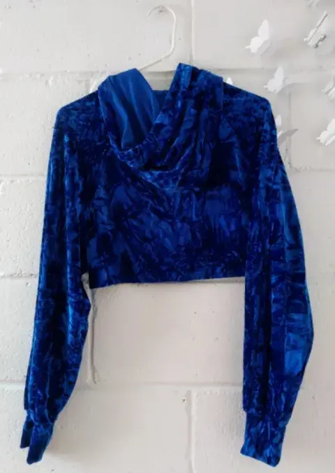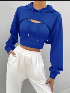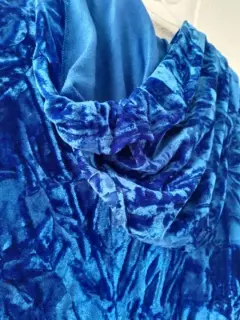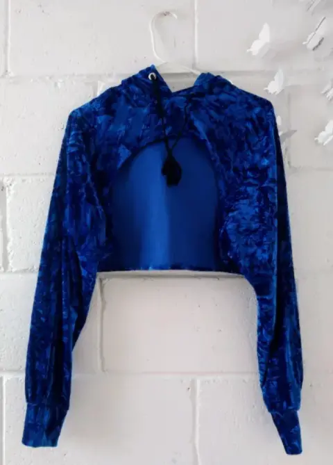 Torerita aterciopelada color azul rey con capucha. Tiene un listón para mejor ajuste. Excelente para usar arriba de un top
