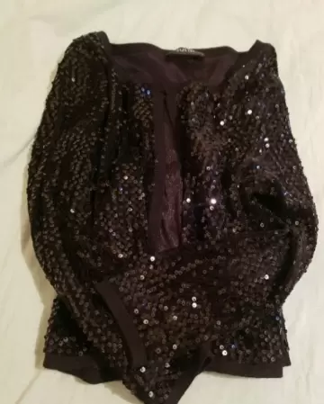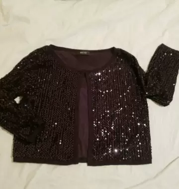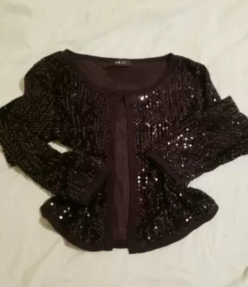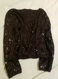 Esta hermoso este torerito todo con lentejuelas en color negro, en poliester, tiene un broche arriba, manga 3/4, ideal para usae casual o una fiesta.