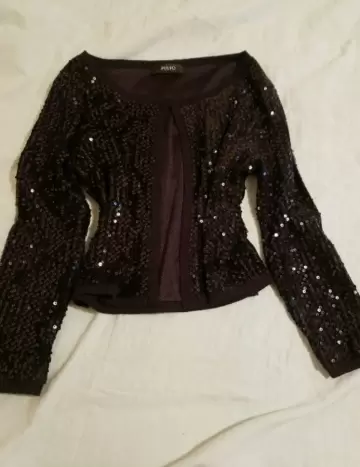 Bellisimo torerito Julio!!. Esta hermoso este torerito todo con lentejuelas en color negro, en poliester, tiene un broche arriba, manga 3/4, ideal para usae casual o una fiesta.