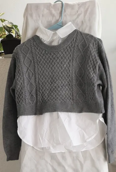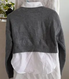 Hermosa blusa con sueter, color gris oxford y blanco, talla Xs, es nueva, no trae detalle, el sueter es delgado,material-poliester, algodón, hombro a hombro-52, axila a axila-47,largo del sueter-33, largo de la manga-50, total del largo, 53, en las imágenes se muestra el reverso de la blusa con el sueter.