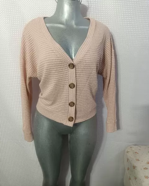 Cárdigan de punto color palo de rosa sin detalles dice talla S pero igual queda una M