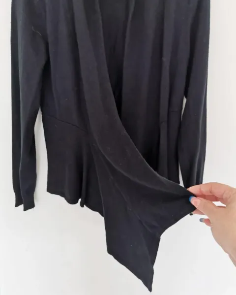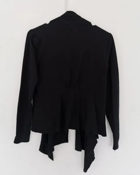 Cardigan de tela ligera. Color negro con corte al frente que le da volumen. Cuello alto que continúa como solapa. Corte en la espalda con algo de drapeado que le da forma. Talla S.