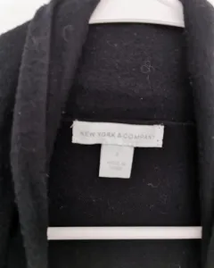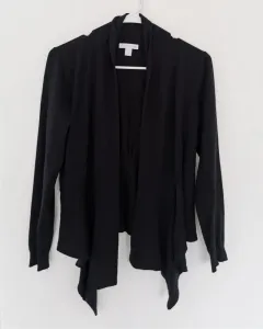 Cardigan corto NY&CO. Cardigan de tela ligera. Color negro con corte al frente que le da volumen. Cuello alto que continúa como solapa. Corte en la espalda con algo de drapeado que le da forma. Talla S.