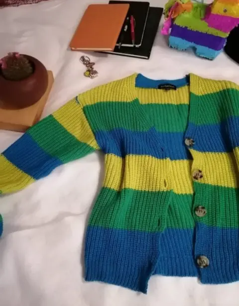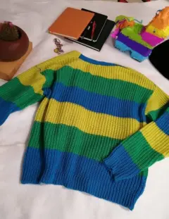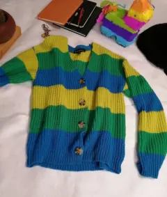 Hermoso cardigan de punto talla ch.Tiene colores muy vivos.Medidas:Axila a axila 47 cmLargo 51 cmManga 49 cmPor el tipo de tela estira hasta 10 cm mas.Solo se usó 2 veces.