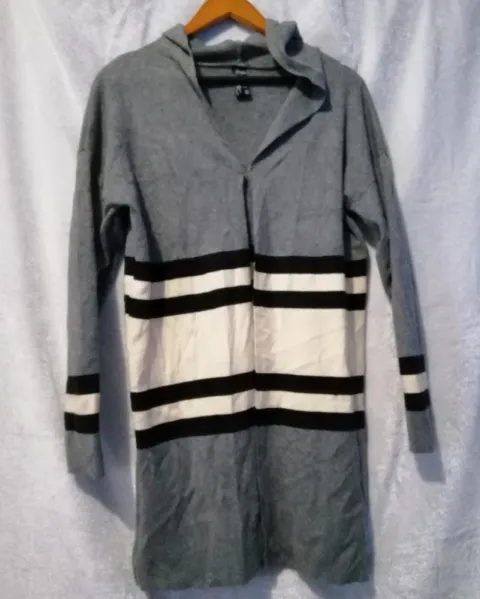 Cardigan gris con gorro,. Cardigan gris con beige, es unitalla pero viene amplio de hombros ideal para tallas G o XG, solo puesto una vez como nuevo