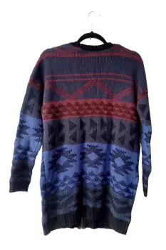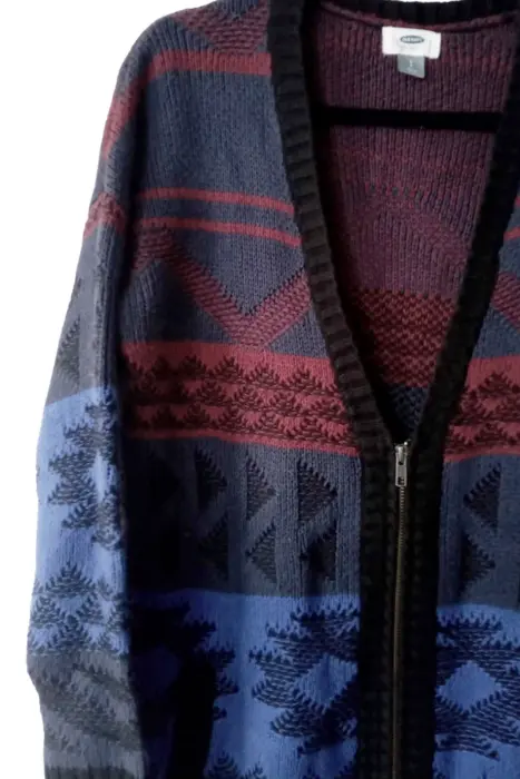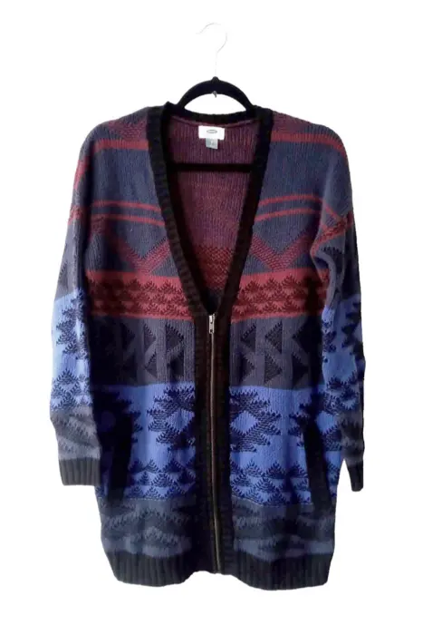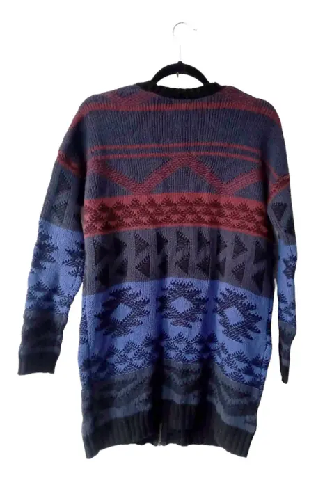Cárdigan de jacard con cierre diseño de grecas, largo, escote V, bolsillos laterales de la marca Old Navy talla S. El producto es usado en excelentes condiciones sin detalles. Proviene de un hogar libre de humo de tabaco y mascotas.Medidashombros: 64 cmssisa: 59 cmscadera: 49 cmslargo: 78 cms60% algodón, 40% acrílico