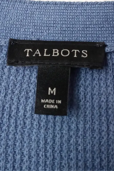 Cárdigan ligero azul Talbots. Cárdigan de cuello redondo, manga larga, en color azul de la marca Talbots talla M. El producto es usado en excelentes condiciones sin detalles. Proviene de un hogar libre de humo de tabaco y mascotas.Medidashombros: 40 cmssisa: 52 cmscadera: 42 cmslargo: 63 cms55% algodón, 35% poliéster, 10% lana