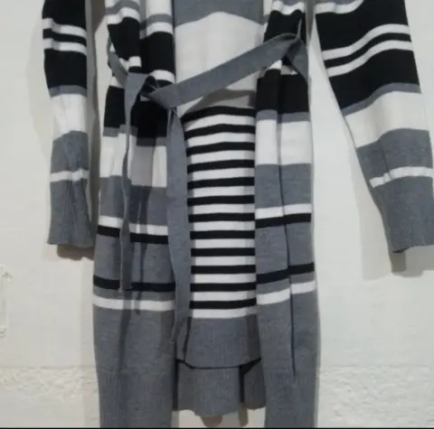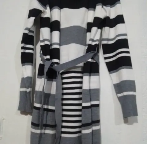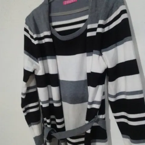 Cárdigan rayado. Prenda versátil y moderna. Las rayas le dan un toque dinámico y estilizado, mientras que la combinación de colores neutros lo hace fácil de combinar con diferentes outfits. Sería perfecto para agregar un toque de estilo a cualquier conjunto, ya sea casual o más formal. ¡Definitivamente sería una gran adición a tu guardarropa! 👚✨