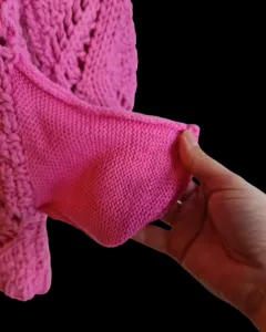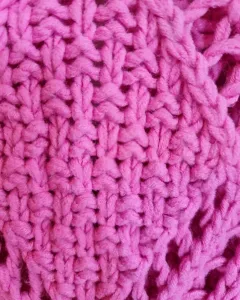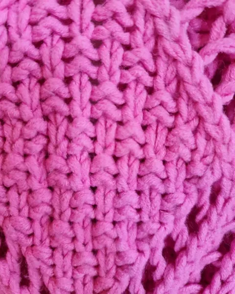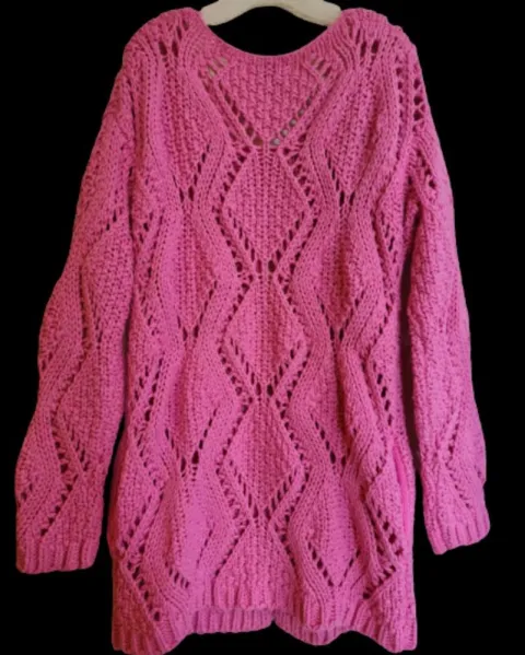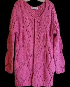 Cardigan color rosa chicle de estambre grueso con dos broches superiores, tiene bolsas a los costados, es unitalla pero queda desde talla chica a talla grande. Medidas: 46 cm ancho, 77 cm largo.