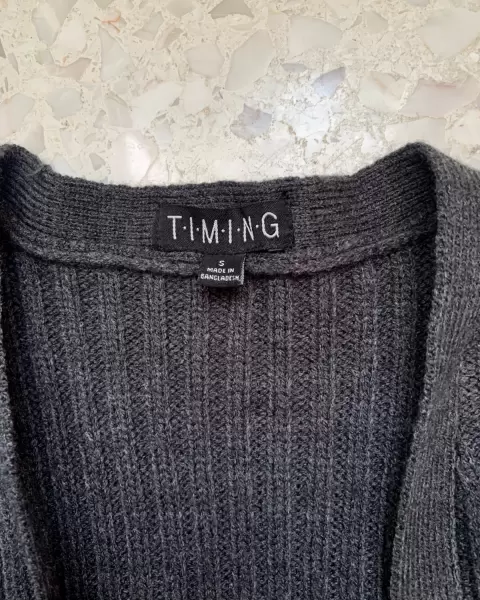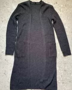 Cardigan largo tejido, tela súper gruesa. Llega hasta la rodilla aproximadamente y es color gris obscuro. Estira bastante entonces puede quedar también a un M