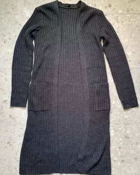 Cardigan sueter largo tejido. Cardigan largo tejido, tela súper gruesa. Llega hasta la rodilla aproximadamente y es color gris obscuro. Estira bastante entonces puede quedar también a un M