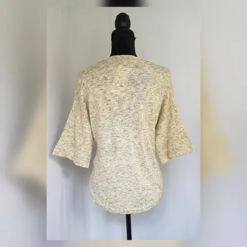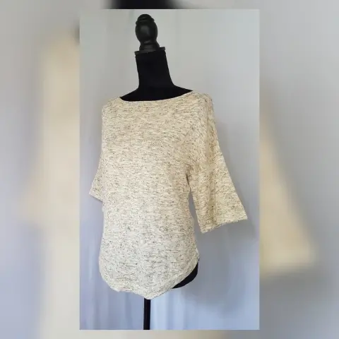 Cuerpo en tejido de punto color PAJA MARMOLEADO, cuello barco y manga 3/4. Talla M. Dimensiones cms: 48 hombro, 54 axila, 53 zona baja, 58 largo, 32 largo. 68% algodón, 24% acrílico, 8% lino. P/lavado en casa.***TIENE UNA PEQUEÑA RASGADURA EN ZONA FRONTAL LATERAL, ASI LO COMPRÉ Y NO LO DETECTÉ. SE ENTREGARÁ REPARADO (ZURCIDO)***