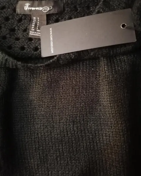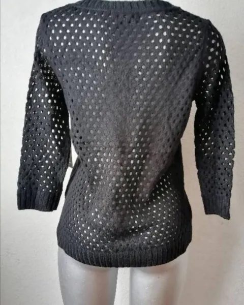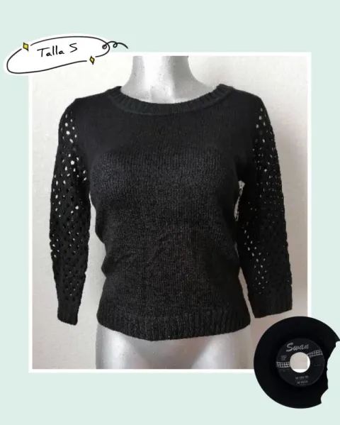 Suéter super bonito negro, de la espalda y en mangas es de puntadas abiertas, puntadas cerradas enfrenteLargo manga 47 cmLargo frente 58 cmLargo trasero 63.5 cmAxila a axila 45.5 cmHombro a hombro 34.5cm