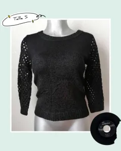 Hermoso suéter negro con hoyuelos. Suéter super bonito negro, de la espalda y en mangas es de puntadas abiertas, puntadas cerradas enfrenteLargo manga 47 cmLargo frente 58 cmLargo trasero 63.5 cmAxila a axila 45.5 cmHombro a hombro 34.5cm