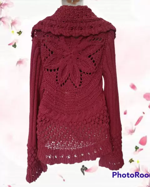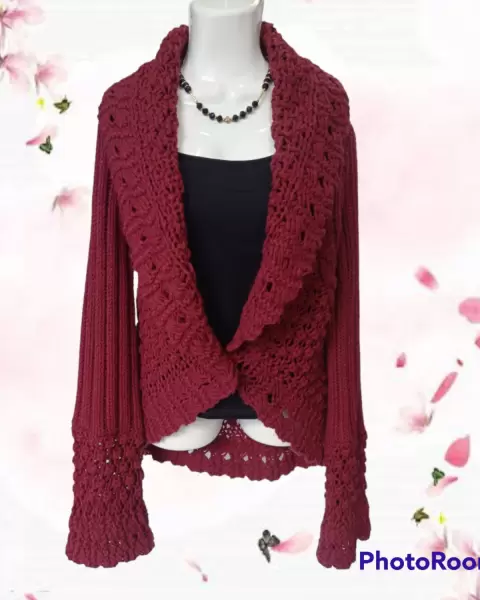 Hermoso y cálido sweater. Sweater holgado de punto. Con solapa ancha, botón al frente, y mangas con puños de olan que hacen que luzca más bello. Da una talla M a L.
