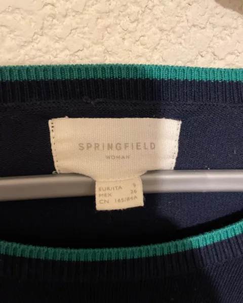 Jersey Springfield. Jersey de manga larga, cuello redondo y botones en el hombro.Es de punto, color azul con líneas blancas