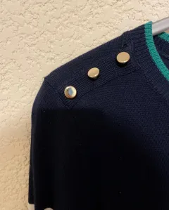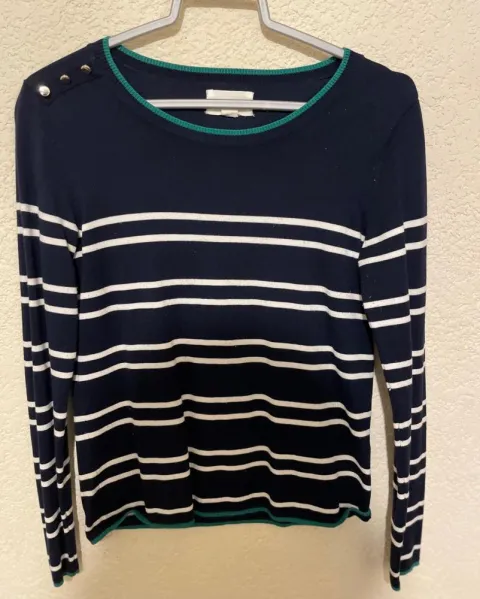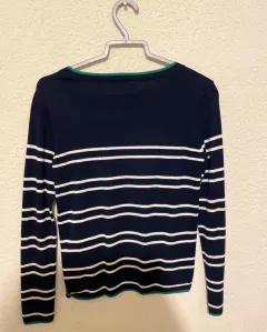 Jersey de manga larga, cuello redondo y botones en el hombro.Es de punto, color azul con líneas blancas