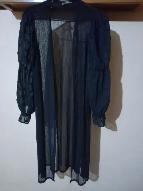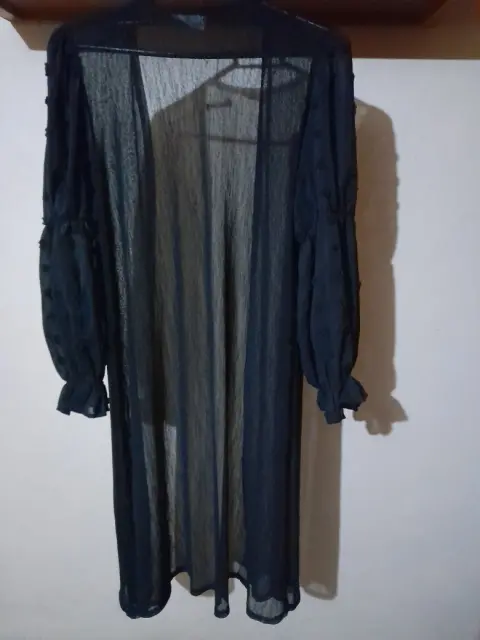 Lindo cardigan largo. Talla mediana, color negro, mangas abombadas con resorte a medio brazo y en muñecas y semitransparente.