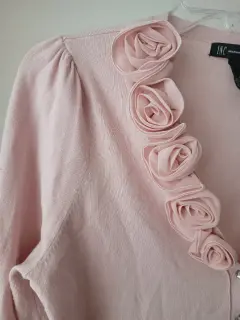 Suéter rosa, súper ligero y calientito, rosas formadas con tela y botones con piedras