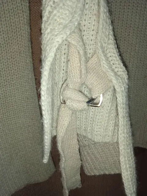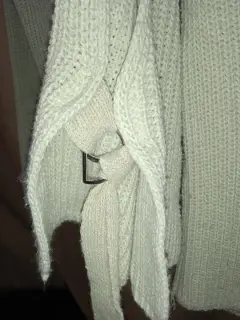 Suéter color beige, detalle de deshilado en cuello, detalle de argollas en los laterales, manga larga. Estilo muy sutil