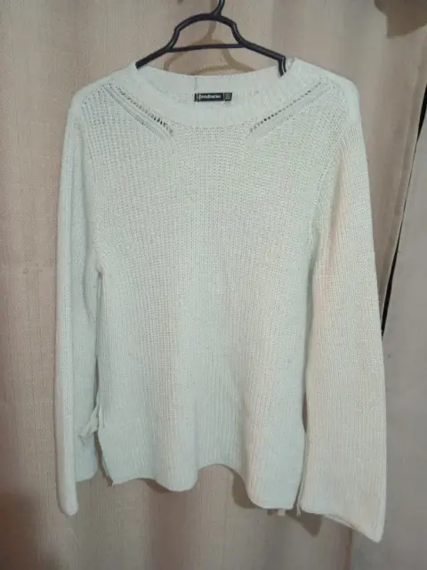Suéter. Suéter color beige, detalle de deshilado en cuello, detalle de argollas en los laterales, manga larga. Estilo muy sutil