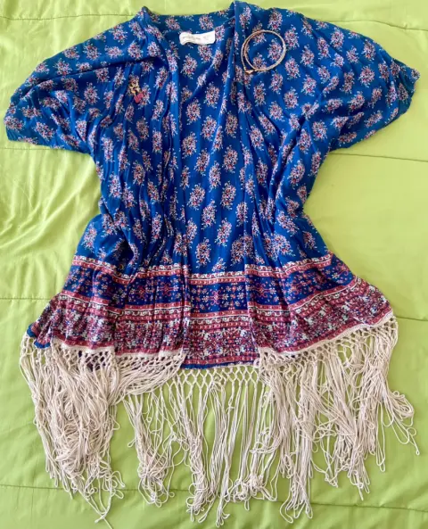Hola tengo este suéter súper lindo para esos días de calor, la tela es fresa y tiene un tejido en la parte baja en color claro que hace un contraste Perfecto con las pequeñas flores estampadas