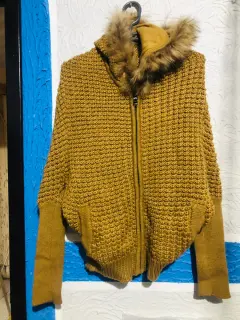 Bonito suéter, color café. Tiene bolsitas a los lados y gorro. De un costado se descosió pero no está roto.