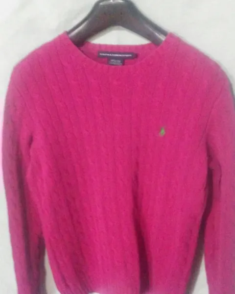 Suéter de cuello redondo, en color rosa con logo en color verde limón. Talla S excelentes condiciones.