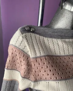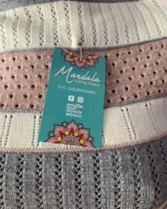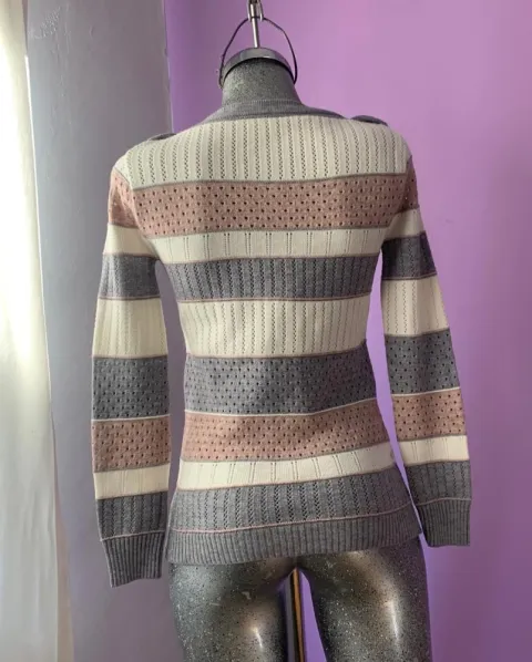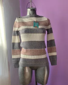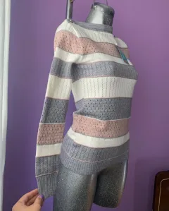 Sueter a rayas. Hermoso suéter súper calientito, está híper suavecito. Es Unitalla, de color gris con blanco y rosa. Sus medidas son: 60cm de largo, 37cm de axila a axila y 59cm de manga.