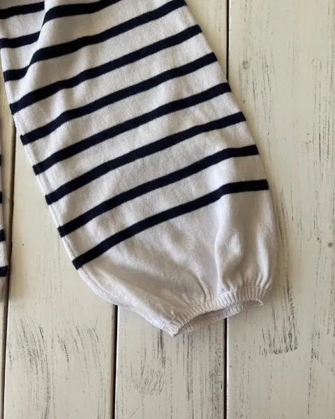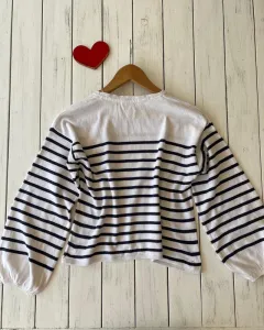Suéter de punto, tela ligera y manga amplia con puños abombados. A rayas azules. Medidas: 49.5 cm axila, 48 cm de largo y 51 cm de hombros.Suéter ligero, cuello redondo. Trae talla de niño. Puede quedar a XS o S holgado.