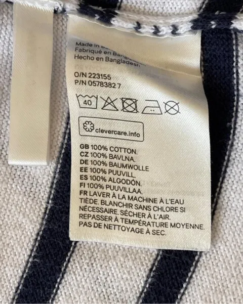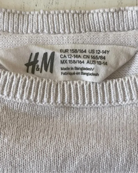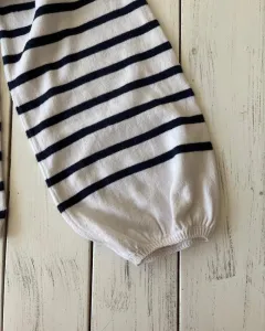 Suéter a rayas de algodón H&M. Suéter de punto, tela ligera y manga amplia con puños abombados. A rayas azules. Medidas: 49.5 cm axila, 48 cm de largo y 51 cm de hombros.Suéter ligero, cuello redondo. Trae talla de niño. Puede quedar a XS o S holgado.