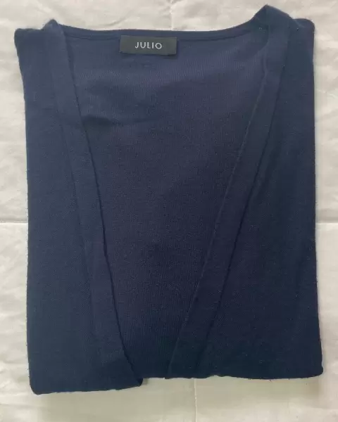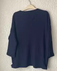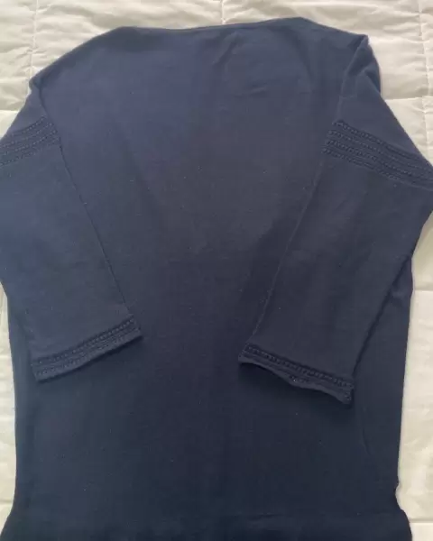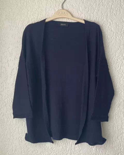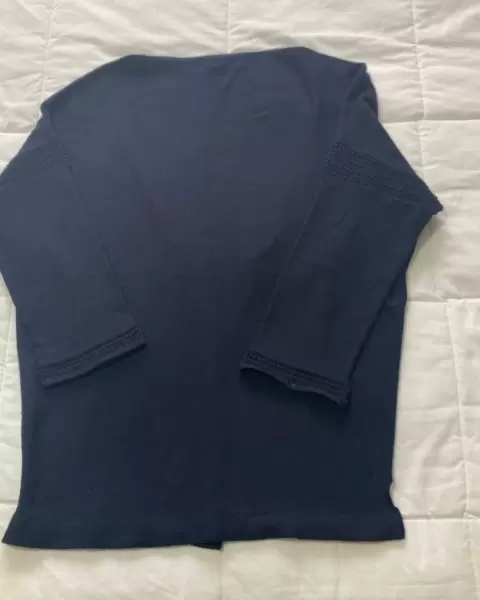 Suéter ligero, abierto, manga raglán 3/4, color azul marino, T/CH, súper cómodo, sin detalles.